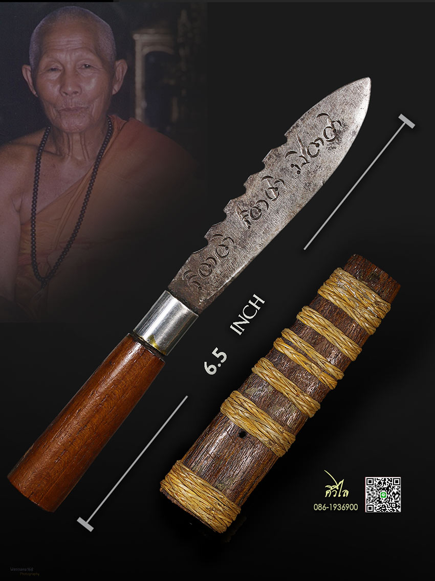 หลวงปู่ท่านเมตตาออกแบบ ลงคาถา หัวใจเเม่ธรณี ธรณีสารช้างเผือ ก เป็นภาษาล้านนา ลงในใบมี ว่า ริติติมุมุธรณีติติ หลวงปู่เมตตาอธิฐานจิตออกให้บูชา ปี 2542 จัดเป็นมี0หมอด้ามไม้รุ่นแรกที่ออกวัดพระพุทธบาทห้วยต้ม