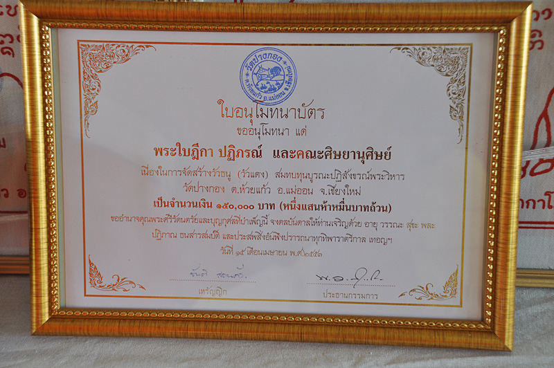 หลวงปู่มอบใบอนุโมทนาบัตรให้กับพระอาจารย์ และคณะกรรมการผู้จัดสร้าง
