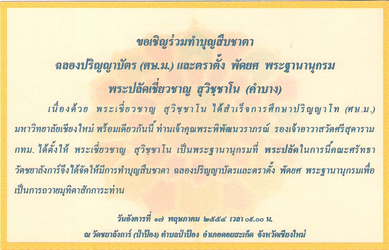 สืบเนื่องจาก พระภิกษุ.เชี่ยวชาญ คำบาง (ตุ๊ปี้น้ำปิง)ที่เคารพของบรรดาผู้นิยมพระเครื่องในเมืองเชียงใหม่+ลำพูน ได้รับการแต่งตั้งให้ได้รับตำแหน่งเป็น พระปลัด.เชี่ยวชาญ คำบาง ในฐานะที่ท่านเป็นพระที่มีอัธยาศัยดีเป็นกันเอง ก็อยากขอเรียนเชิญบรรดาผู้ที่รู้จักคุ้นเคย ร่วมงานแสดงมุทิตาจิต ในครั้งนี้ตามรายละเอียดที่แนบมาครับ