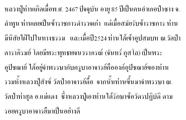 หลวงปู่ท่านเกิดเมื่อพ.ศ. 2467 ปัจจุบัน อายุ 85 ปีเป็นคนอำเภอป่าซาง จ.ลำพูน ท่านเคยเป็นข้าราชการตำรวจเก่า แต่เมื่อสมัยรับข้าราชการ ท่านมีนิสัยไฝ่ไปในทางธรรม และเมื่อปี2524 ท่านได้เข้าอุปสมบท ณ.วัดป่าดาราภิรมย์ โดยมีพระพุทธพจนวราภรณ์ (จันทร์ กุสโล) เป็นพระอุปัชฌาย์ ได้อยู่จำพรรษากับครูบาอาจารย์คือองค์อุปัชฌาย์ของท่าน รวมทั้งหลวงปุ่สังข์ วัดป่าอาจารย์ตื้อ จากนั้นท่านขึ้นมาจำพรรษา ณ. วัดป่าท่าสุด อ.แม่แตง ซึ่งหลวงปู่เองท่านได้รักษาข้อวัตรปฏิบัติ ตามรอยครูบาอาจารย์มาเป็นอย่างดี |