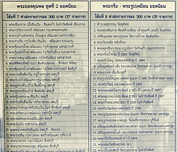 | โต๊ะ 7 พระยอดขุนพล ชุดที่ 2 ยอดนิยม รวม 37 รายการ,โต๊ะ 8 พระกริ่ง-พระรูปเหมือน ยอดนิยม รวม 35 รายการ |