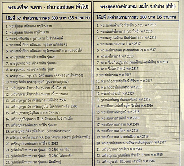 | โต๊ะ 57 พระเครื่อง จ.ตาก-อำเภอแม่สอด (ทั่วไป) รวม 35 รายการ,โต๊ะ 58 พระชุดหลวงพ่อเกษม เขมโก จ.ลำปาง (ทั่วไป) รวม 35 รายการ |