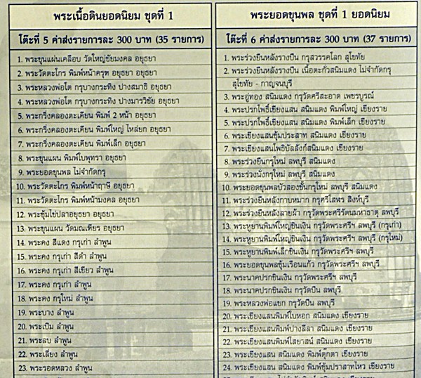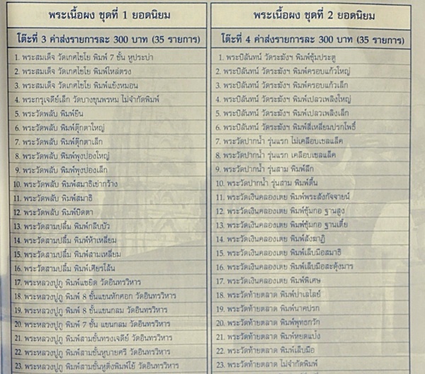 | โต๊ะ 3 พระเนื้อผง ชุดที่ 1 ยอดนิยม รวม 35 รายการ,พระเนื้อผงชุดที่ 2 ยอดนิยม รวม 35 รายการ |