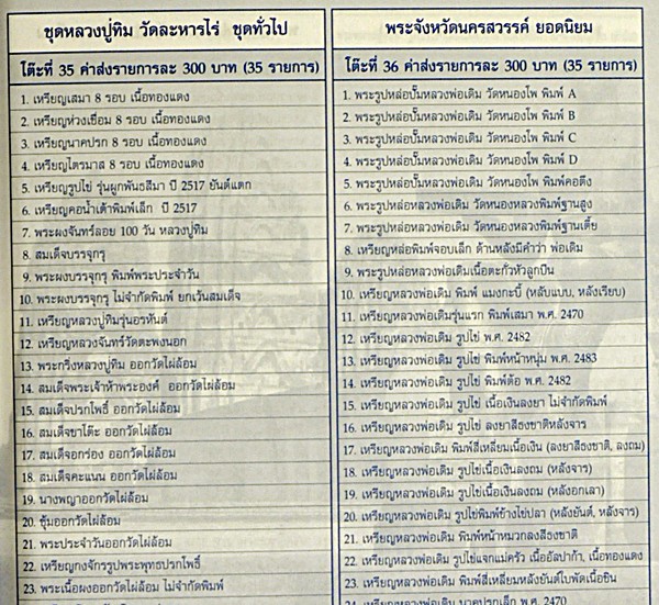 | โต๊ะ 35 ชุดหลวงปู่ทิม วัดละหารไร่ ชุดทั่วไป รวม 35 รายการ,โต๊ะ 36 พระจังหวัดนครสวรรค์ ยอดนิยม รวม 35 รายการ |