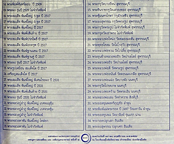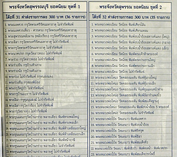 | โต๊ะ 31 พระจังหวัดสุพรรณบุรี ยอดนิยม ชุดที่ 1 รวม 36 รายการ,โต๊ะ 32 พระจังหวัดสุพรรณบุรี ยอดนิยม ชุดที่ 2 รวม 35 รายการ |