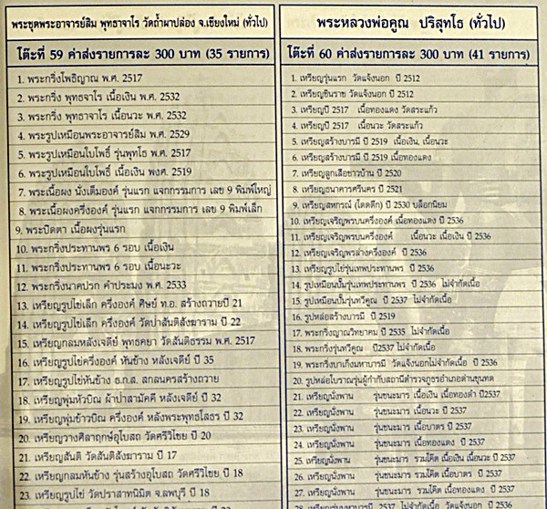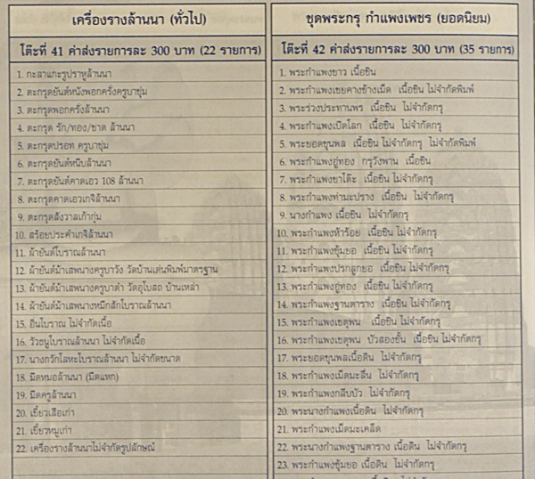 | โต๊ะ 41 เครื่องรางล้านนา (ทั่วไป) รวม 22 รายการ,โต๊ะ 42 ชุดพระกรุ กำแพงเพชร (ยอดนิยม) รวม 35 รายการ |