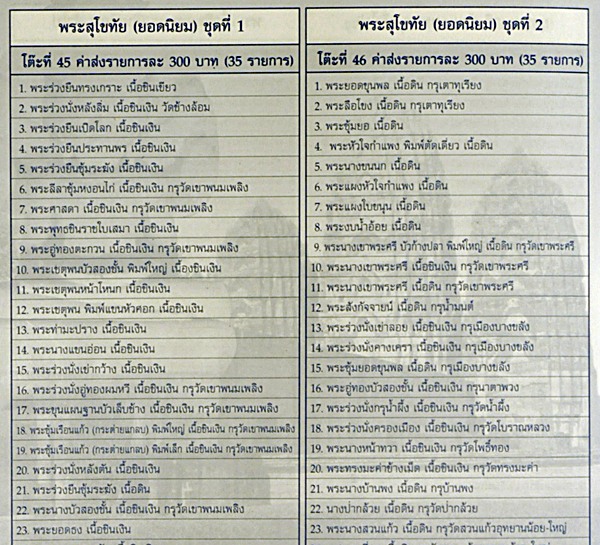 | โต๊ะ 45 พระสุโขทัย (ยอดนิยม) ชุดที่ 1 รวม 35 รายการ,โต๊ะ 46 พระสุโขทัย (ยอดนิยม) ชุดที่ 2 รวม 35 รายการ |