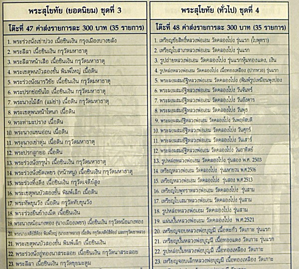 | โต๊ะ 47 พระสุโทย (ยอดนิยม) ชุดที่ 3 รวม 35 รายการ,โต๊ะ 48 พระสุโขทัย (ทั่วไป) ชุดที่ 4 รวม 35 รายการ |