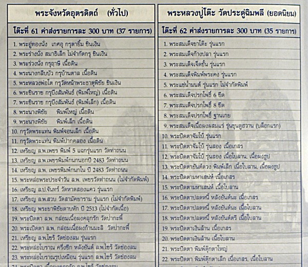| โต๊ะ 61 พระจังหวัดอุตรดิตถ์ (ทั่วไป) รวม 37 รายการ,โต๊ะ 62 พระหลวงปู่โต๊ะ วัดประดู่ฉิมพลี (ยอดนิยม) รวม 35 รายการ |