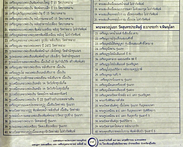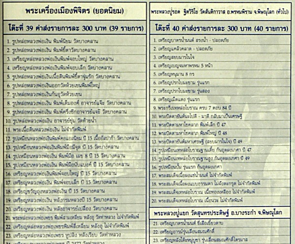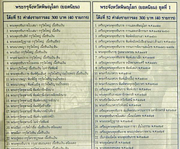 | โต๊ะ 51 พระกรุจังหวัดพิษณุโลก (ยอดนิยม) รวม 40 รายการ,โต๊ะ 52 พระจังหวัดพิษณุโลก (ยอดนิยม) ชุดที่ 1 รวม 40 รายการ |