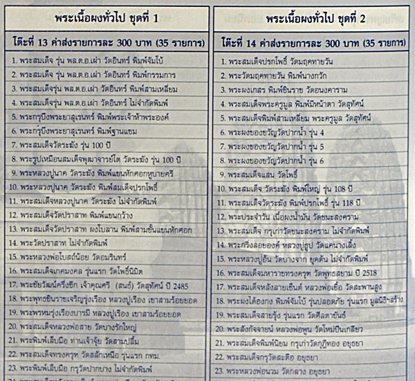 | โต๊ะ 13 พระเนื้อผงทั่วไป ชุดที่ 1 รวม 35 รายการ,โต๊ะ 14 พระเนื้อผงทั่วไป ชุดที่ 2 รวม 35 รายการ |