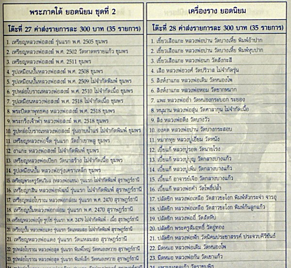 | โต๊ะ 27 พระภาคใต้ ยอดนิยม ชุดที่ 2 รวม 35 รายการ,โต๊ะ 28 เครื่องราง ยอดนิยม รวม 35 รายการ |