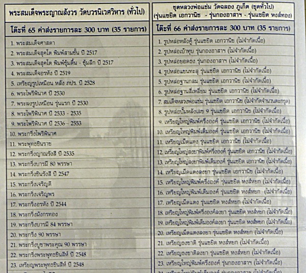 | โต๊ะ 65 พระสมเด็จพระญาณสังวร วัดบวรนิเวศวิหาร (ทั่วไป) รวม 35 รายการ,โต๊ะ 66 ชุดหลวงพ่อแช่ม วัดฉลอง ภูเก็ต (ชุดทั่วไป) (รุ่นแซยิด เอกวานิช-รุ่นกองอาสาฯ-รุ่นแซยิด หงส์ทอง) รวม 35 รายการ |