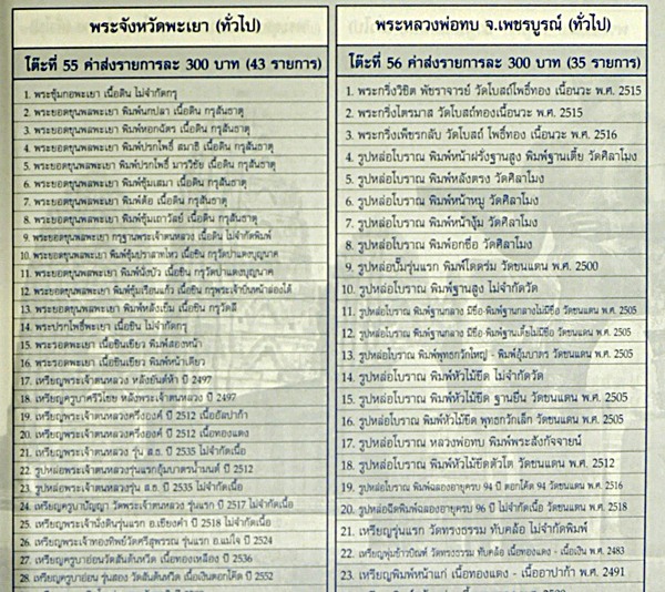 | โต๊ะ 55 พระจังหวัดพะเยา (ทั่วไป) รวม 43 รายการ,โต๊ะ 56 พระหลวงพ่อทบ จ.เพชรบรูณ์ (ทั่วไป) รวม 35 รายการ |