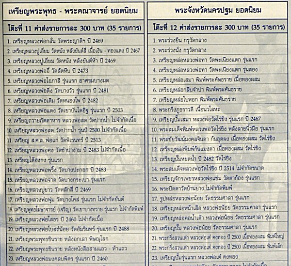 | โต๊ะ 11 เหรียญพระพุทธ-พระคณาจารย์ ยอดนิยม รวม 35 รายการ,โต๊ะ 12 พระจังหวัดนครปฐมยอดนิยม รวม 35 รายการ |