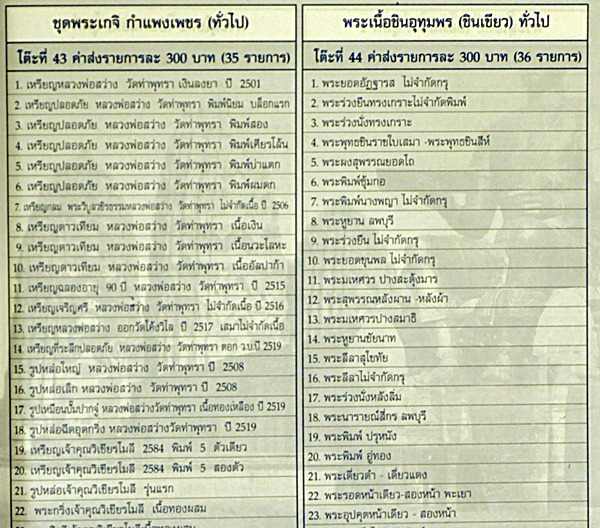 | โต๊ะ 43 ชุดพระเกจิ กำแพงเพชร (ทั่วไป) รวม 35 รายการ,โต๊ะ 44 พระเนื้อชินอุทุมพร(ชินเขียว) ทั่วไป รวม 36 รายการ |