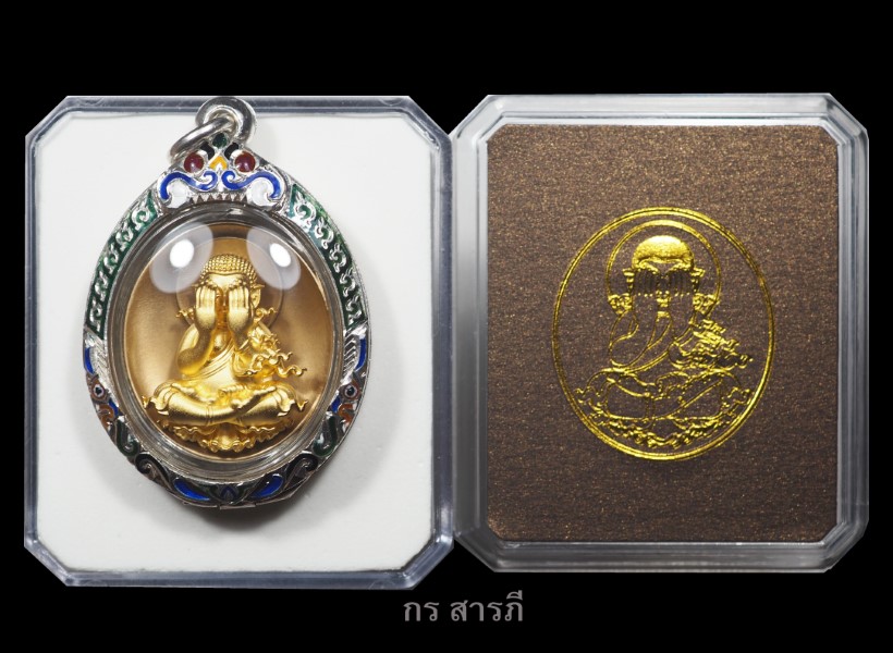องค์นี้เนื้อบรอนซ์รมซาตินองค์พระชุบทอง เลี่ยมกันน้ำพร้อมใส่ตลับเงินลงยาสวยๆพร้อมใช้ มีกล่องเดิมๆครบ