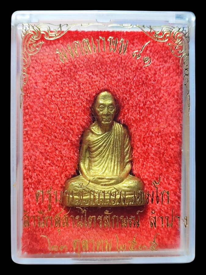รูปหล่อลอยองค์ปั๊ม เนื้อทองเหลือง (บรรจุมวลสาร 9 มงคล) รุ่นมงคลเกษม 81 ผิวเดิม หลวงพ่อเกษม เขมโก เมตตาอธิษฐานจิตปลุกเสกเมื่อวันที่ 23 ตุลาคม 2535 ใต้ฐานบรรจุมวลสาร 9 มงคล และอุดขี้ผึ้งเทียนชัย ข้าวก้นบาตรและมวลสารอันศักดิ์สิทธิ์ไว้ ตอกโค๊ต "เกษม" ชัดเจน พร้อมกล่องเดิม