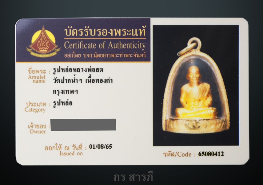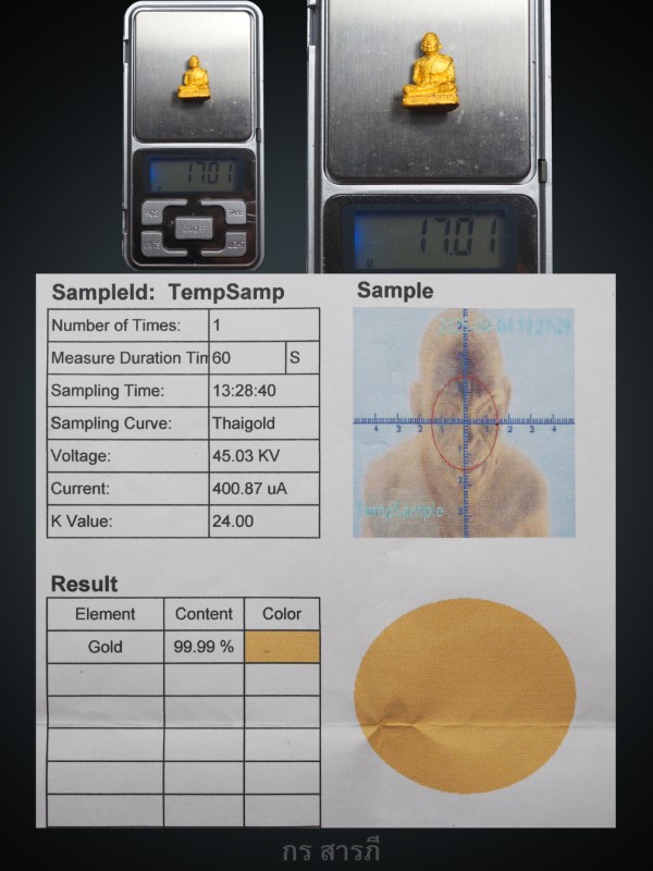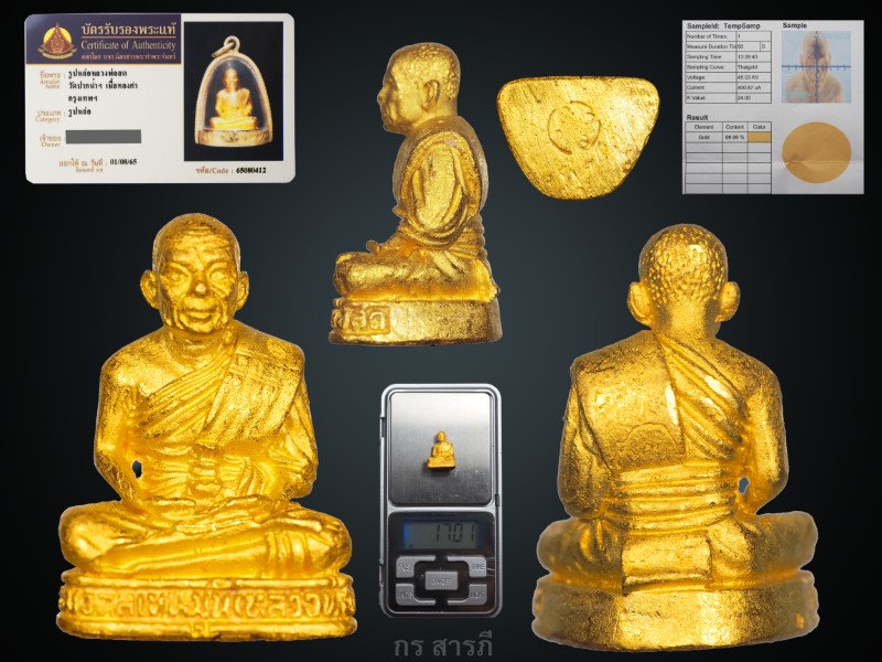 สร้างจากเนื้อทองคำบริสุทธิ์ 99.99 % องค์พระหนัก 17 กรัม พร้อมบัตรรับรองพระแท้มาตรฐาน จาก "นิตยสารพระท่าพระจันทร์" รหัส/Code : 65080413 ออกให้ ณ วันที่ 01/08/65 และใบยิงเปอร์เซ็นทองอีก1ใบ
