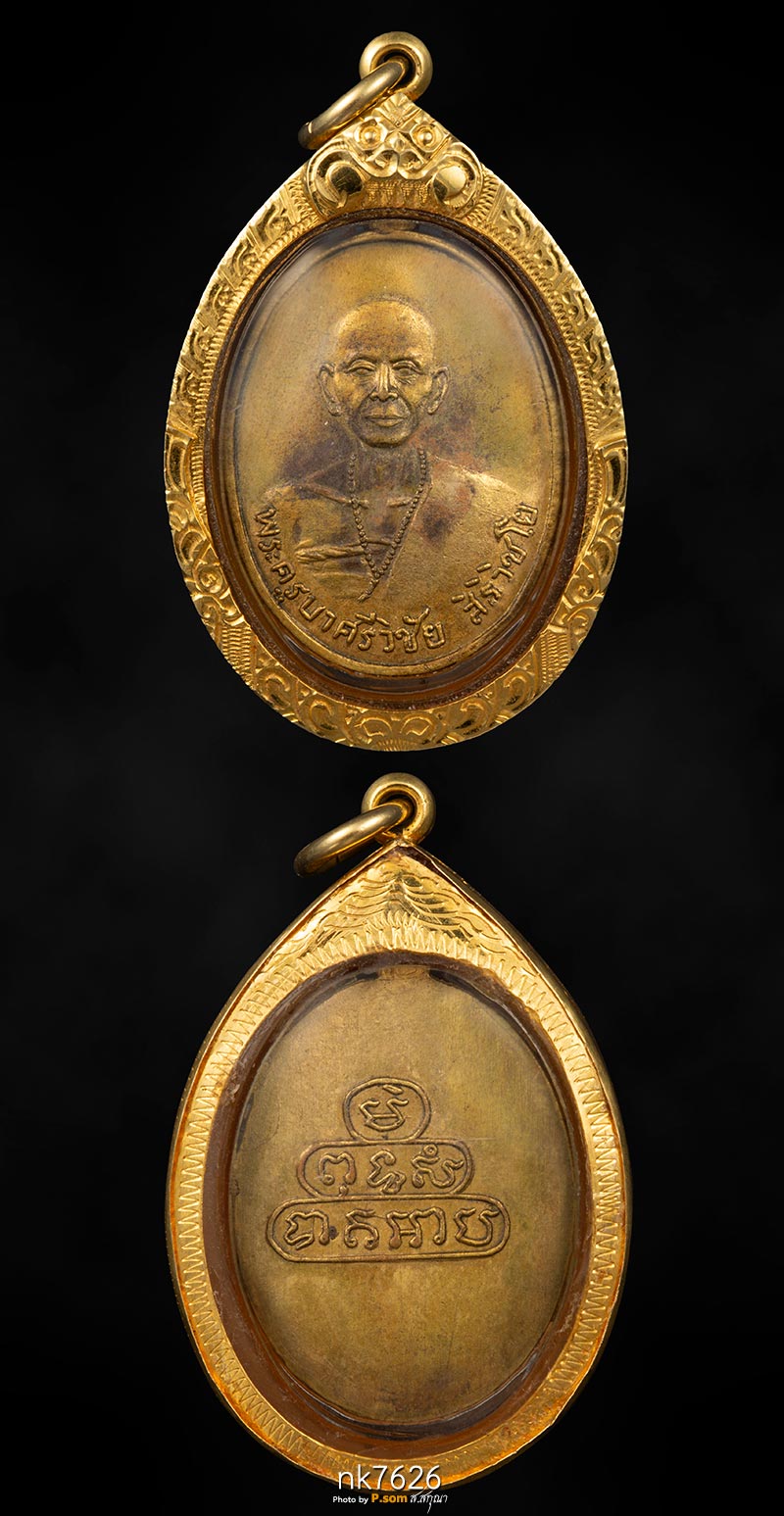 เหรียญครูบาศรีวิชัย ยันต์น้ำเต้า ประคำเม็ด เนื้อทองแดงกะไหล่ทอง วัดบ้านปาง ปี 2492 พร้อมเลี่ยมทอง