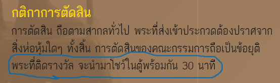2.กรรมการตัดสินเสร็จให้นำพระออกมาโชว์ประมาณ 30 นาทีแล้วจึงเริ่มประกาศให้ผู้ที่ส่งพระแล้วไม่ติดรางวัลให้มารับพระก่อนแล้วถึงค่อยแจกรางวัลชมเชย , รางวัลที่ 3 , รางวัลที่ 2 , รางวัลที่ 1 ตามลำดับเพราะว่า...หากผู้ที่ได้รับรางวัลที่ 2 ติดใจว่าพระของเขาสวยกว่าของรางวัลที่ 1 กรรมการสามารถนำพระที่ติดรางวัลที่ 1 มาให้เจ้าของพระที่ติดใจมาเปรียบเทียบและมีคำตอบให้กับเจ้าของพระว่าทำไมพระของคุณถึงติดรางวัลที่ 2 จุดใดที่สู้ของที่ 1ไม่ได้( กรรมการต้องตอบคำถามให้ได้โดยที่ไม่ใช้อารมณ์ใส่ผู้ที่ส่งพระ )