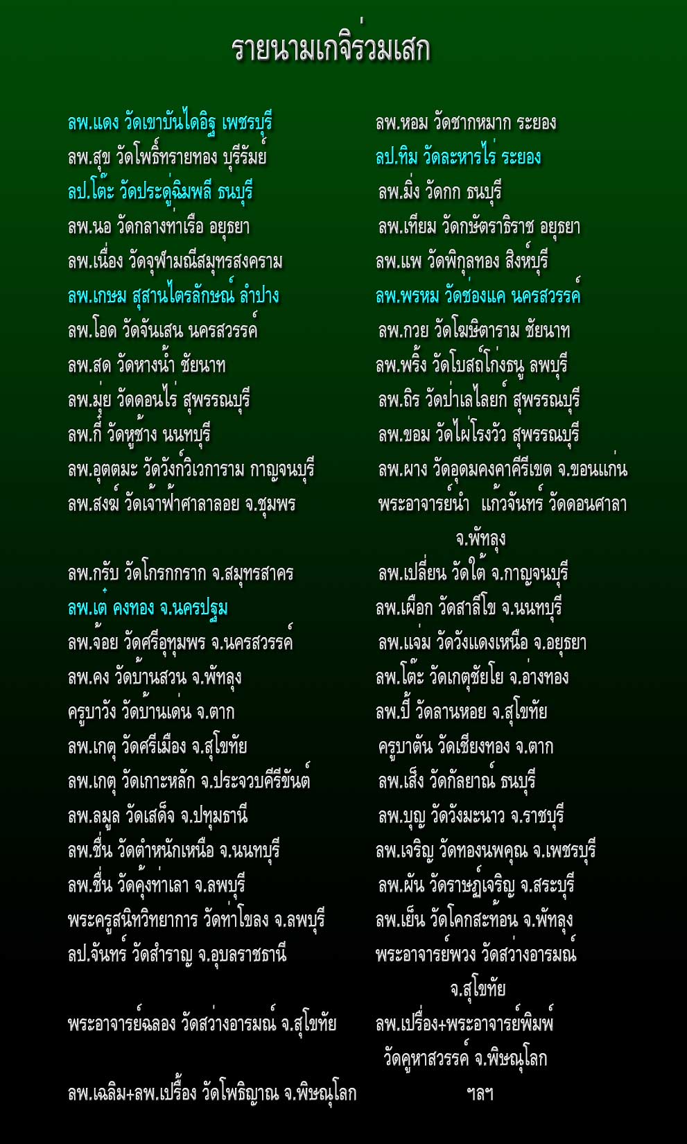 รายชื่อพระคณาจารย์ที่เป็นสีฟ้านั้น ผมต้องการชี้ให้เห็นว่า เป็นรายชื่อพระคณาจารย์ที่พระเครื่องหรือวัตถุมงคลบางรุ่นที่ท่านปลุกเสกเดี่ยว ปลุกเสกเองนั้น ราคาขึ้นหลักแสนไปแล้วครับ