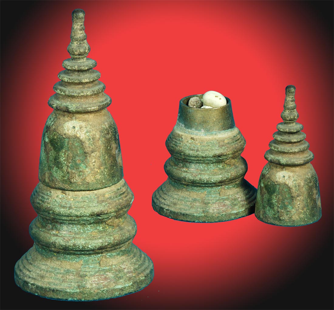 สนิมเขียว ด้านในมีพระอัฐิธาตุ แก้ว เศษเงินเจียง และทองคำ