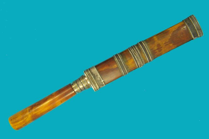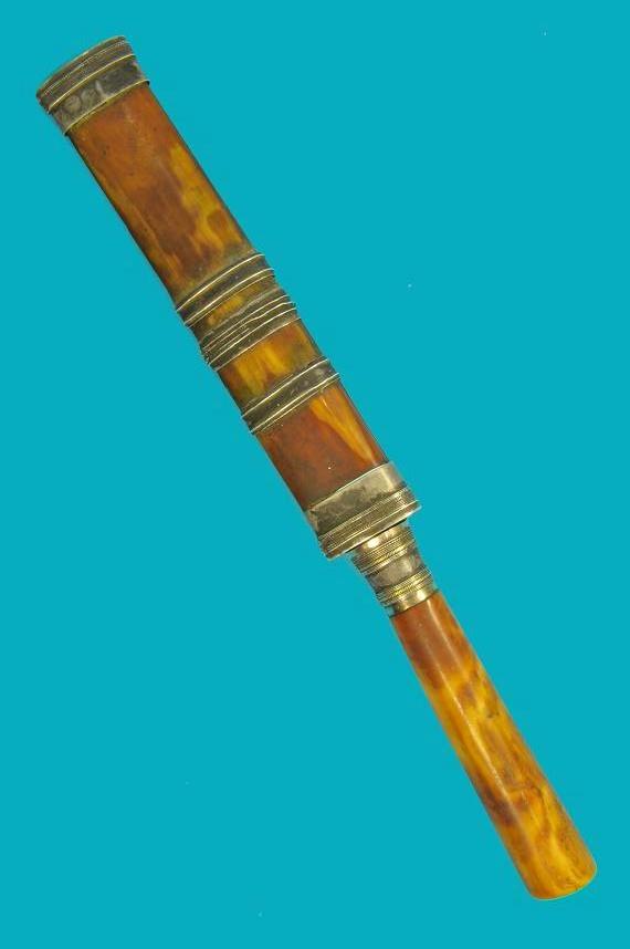 มีดหมอเล่มนี้อยากเอามาให้ชมเพราะมีความพิเศษหลายอย่างอยู่ในเล่มเดียวกันครับ เป็นมีดใบขนาดหกนิ้วครึ่ง วัดรวมตลอดเล่มแล้วสิบเอ็ดนิ้ว เป็นมีดด้ามงา ฝักงา ซึ่งพบน้อยมากในมีดขนาดกลางแบบนี้ ส่วนมากจะเป็นฝักไม้ และกั่นมีดเป็นสามกษัตริย์ ทองคำ นาก เงิน แกะลายเสมาครึ่งใบ ฝีมือช่างฉิมแน่แท้ และพบลายนี้น้อยมากเช่นกันครับ งานั้นเป็นงาขนาย หรืองาอ่อน ซึ่งธรรมชาติจะมีความแน่นในอนูเนื้อไม่แตกรานเหมือนงาประเภทอื่น ด้วยอายุนานจะมีสีเหลืองเก่าหม่นตามธรรมชาติ แต่ไม่แยะแตก มีดแบบนี้ในสมัยนั้นการสั่งให้ช่างทำมีราคาแพงมาก ชาวบ้านธรรมดามิอาจได้ครอบครอง นอกจากจะเป็นเจ้าขุนมูลนาย คหบดีมีเงินเท่านั้นครับ เขาว่าค่าสั่งทำแบบนี้ราคาเท่ากับข้าวเปลือกถึงหกเกวียนทีเดียว