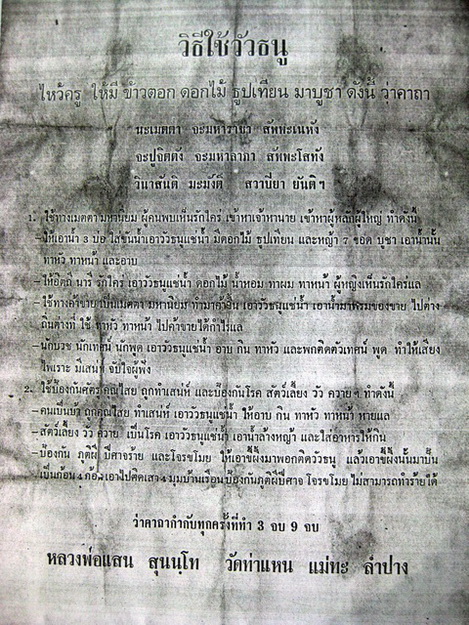 ติดตามน่ะลงมา ก่ยังมี.. งัวอยู่ตัวนึ่ง จื่อว่างัวธะนู นะทรงเครื่อง...สีของมันนะ มันเป็นสีขาวกือว่าย่ะมาจากแร่เงิน บอริสุด พุดผ่อง เป็นย่องเป้นใย จ๊ะตาวันเกิดของมันนั้นเล่า ก่เกิดเมื่อปี๋ นึ่งแปดปู๊นหละ ถิ่นฐานนะกำเหนิด ล่ะอยู่ตี่แม่ทะ จังหวัดลำปาง ล่ะจ้ะมีใผ่สนใจ ผ่องก่อ....แลเฮยยยย |