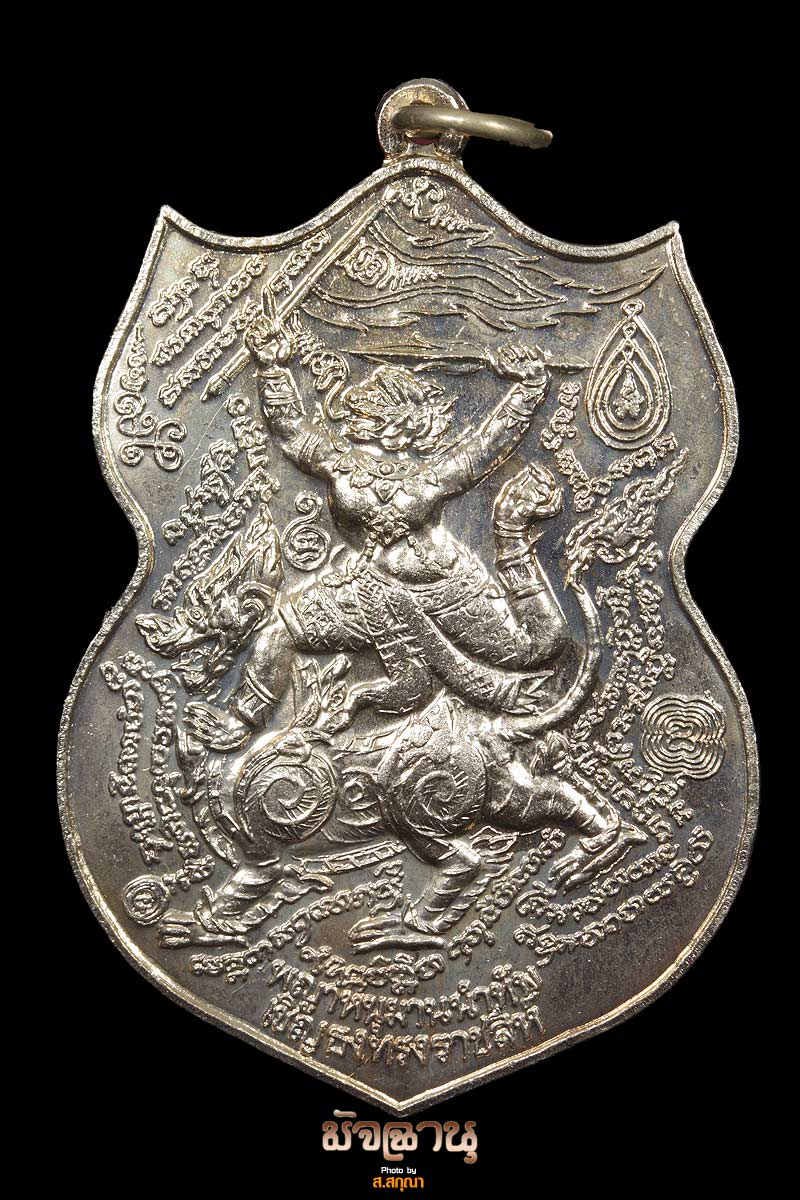+++เหรียญเด้งดึ๋ง หลวงปู่กาหลง 2547+++เหรียญเด้งดึ๋งหรือเหรียญหนุมานเชิญธงทรงราชสีห์ เนื้อเนื้ออัลปาก้าตามตำรับของหลวงปู่กาหลงเหรียญหนุมานเชิญธงทรงราชสีห์ไตรมาสปี 2547 หลวงปู่กาหลง(เขี้ยวแก้ว) วัดเขาแหลม ท่านดำริให้จัดสร้างขึ้นเพื่อสืบตำนานความเข้มขลังศักดิ์ยิ่งใหญ่เกรียงไกร ในอดีต เพื่อให้คงอยู่ตราบชั่วลูกหลานสืบไปโดยจัดสร้างขึ้นเพื่อทำการปลุกเสกให้ใช้ได้ตราบชั่วลูกหลายสืบไป โดยจัดสร้างขึ้งเพื่อทำการปลุกเสกในวันไหว้ครูเมื่อ พ.ศ.25 47 เสกไตรมาส 2547 และ ร่วมพิธีกรรมศักดิ์สิทธิ์ 9 ขั้นตอน , พุทธาภิเษกวันเพ็ญเดือน 12 และอธิษฐานจิตประจุพุทธาคมปลุกเสก เดี่ยวทำการพุทธาภิเษก ต่อหน้าศาลท้าวมหาพรหมสุริยเทพ วัดเขาแหลม และยังได้ประกอบพิธีพุทธาภิเษกครั้งสุดท้ายอีกครั้งอีกด้วยพุทธคุณเหรียญหนุมานเชิญธงทรงราชสีห์ ด้านหลังประทับด้วยยันต์องค์พระตัวเฑาะมหาอุด สุดยอดแห่งชัยชนะเหนือคนทั้งปวง เนื้ออัลปาก้า หรือ เหรียญเด้งดึงรุ่นแรกครับ ที่มีประสบการณ์มาแล้วครับ เพื่อให้มีพละกำลังต่อสู้ เอาชนะข้าศึกอริราชศัตรูปหมู่คนพาลต่างๆ ก็ปรากฏเฉพาะยันต์ลิงหนุมานอยู่ในตำราของท่าน ดังนั้น เหรียญหนุมานเชิญธงทรงราชสีห์นี้สามารถแขวนบริเวณเอวได้หรือคล้องที่พวงกุญแจก็ไม่เสื่อมแล สำหรับตำราหนุมานนี้เป็นวิทยาการโบราณที่ถือเป็นสุดยอดของ วิทยาการฝ่ายนักรบ ในวิชาธนุเวทแห่งตำรา นีติประกาศิตา ซึ่งเป็นคัมภีร์ฝ่ายไสยศาสตร์ที่ผูกร่วมกับตำราพิชัยสงคราม โดยปรากฏครั้งแรกในรัชสมัย สมเด็จพระรามธิบดีที่ 2 แห่งกรุงศรีอยุธยา ในช่วง พ.ศ. 2041 โดยที่เคล็ดของวิชานี้เป็นวิทยาการโบราณที่สร้างความผสมผสานพละกำลังระหว่าง จิตใจกับร่างกาย แล้วดึงผลสำเร็จที่เกิดขึ้นมาใช้อย่างมีประสิทธิภาพ โดยผู้สำเร็จวิชานี้สามารถออกกำลังได้ถึง หนึ่งพันเท่าของกำลังชายฉกรรจ์ ผู้แข็งแรงตามปกติ เหรียญนี้ เนื้ออัลปาก้า ตอก 3 โค๊ดสวยๆครับพร้อมซองเดิม สภาพใหม่ไม่เคยเอาออกมาใช้