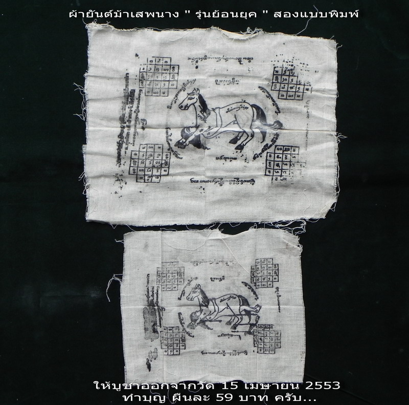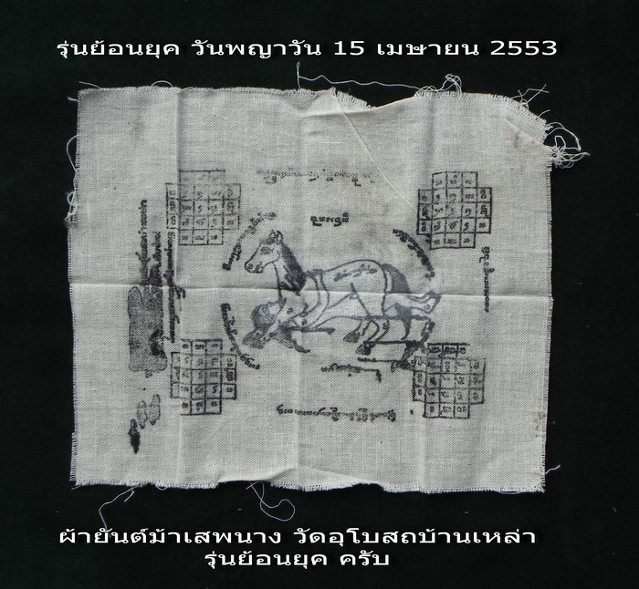 | ผ้ายันต์ม้าเสพนาง เป็นรุ่นสุดท้าย ครูบาต๋า ที่ทันท่านปลุกเสก ปี พ.ศ.2530 - 2531 ชื่อ " พี่นงนุช " เเละ " พี่อำพร " ครับ... |