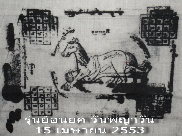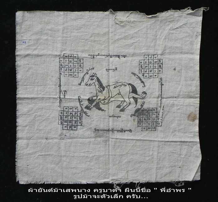| ผ้ายันต์ม้าเสพนาง(ยุคต้น) ครูบาต๋า ผ้าผืนนี้ชื่อ " พี่ศรีทอง " ชื่อเล่นว่า " พี่ต้อย " ครับ... |