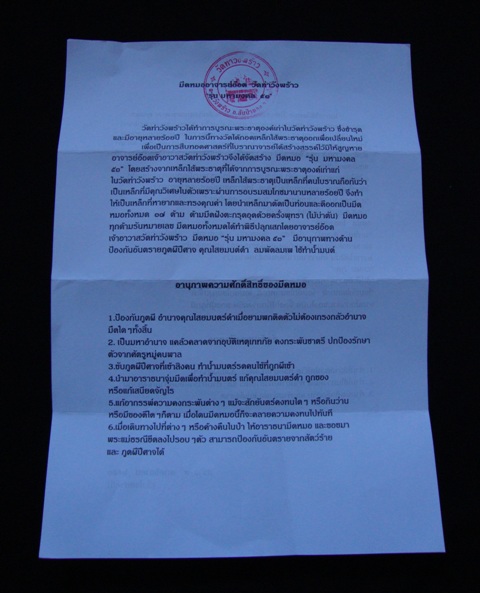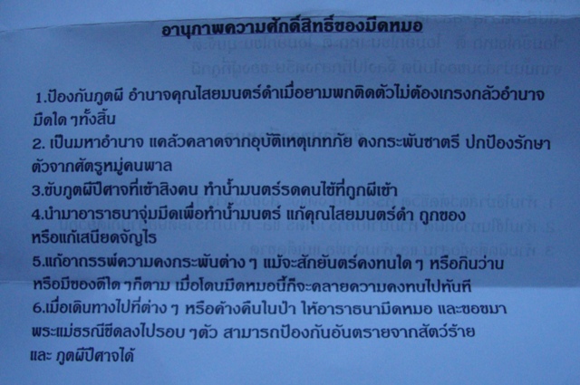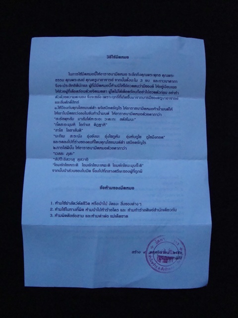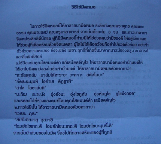 วัดท่าวังพร้าวได้จัดสร้างมีดหมอขนาดใบมีดยาว 5 นิ้ว ทั้งใบมีดและด้ามยาวประมาณ 9 นิ้ว ตัวมีดทำจากเหล็กใส้พระธาตุที่ได้จากการบูรณะพระธาตุองค์เก่าที่ชำรุดซึ่งมีอายุหลายร้อยปีนำมาตัดเป็นท่อนและตีออกมาเป็นมีดหมอ ซึ่งเหล็กใส้พระธาตุที่นำมาทำในครั้งนี้สามารถตีออกมาเป็นมีดหมอได้ทั้งหมด 37 ด้าม เหล็กใส้พระธาตุเป็นเหล็กที่คนโบราณถือว่ามีคุณวิเศษในตัวผ่านการอบรมสมโภชน์มานานหลายร้อยปีจึงทำให้เป็นเหล็กที่หายากและทรงคุณค่า ด้ามมีดฝังตะกรุดอุดด้วยครั่งไม้หบะตัน ในการจัดสร้างครั้งนี้ได้ออกแบบใบมีดและฝักจากช่างทำมีดฝีมือดีจากจังหวัดลำปาง จากนั้นทำการจารย์ยันต์ลงบนใบมีดตามตำราการสร้างและปลูกเสกของครูบาติ๊บที่ได้บันทึกไว้ คาถาที่เสกล้วนเป็นคาถาที่ท่านได้บันทึกและถ่ายทอดให้อาจารย์อ๊อดเจ้าอาวาสวัดท่าวังพร้าวองค์ปัจจุบันได้นำมาสร้างและปลูกเสกมีดหมอในครั้งนี้ วัตถุประสงค์ในการสร้างเพื่อนำรายได้สมทบทุนในการสร้างหอพระไตรปิฏกวัดท่าวังพร้าวที่อยู่ระหว่างการดำเนินการสร้างยังไม่แล้วเสร็จและให้ผู้ที่สนใจและศรัทธาอย่างแท้จริงได้มีไว้บูชารวมทั้งสืบทอดศาสตร์ที่ทรงคุณค่าเรื่องการสร้างมีดหมอที่ครูบาอาจารย์ได้มอบไว้มิให้สูญหาย * มีดหมอทุกด้ามรันหมายเลขด้ามนี้ของผมเองครับหมายเลข 9 มีใบฝอย (วิธีใช้ ข้อห้าม และคาถากำกับมีดหมอ) พร้อมซองกำมะหยี่อย่างดี |