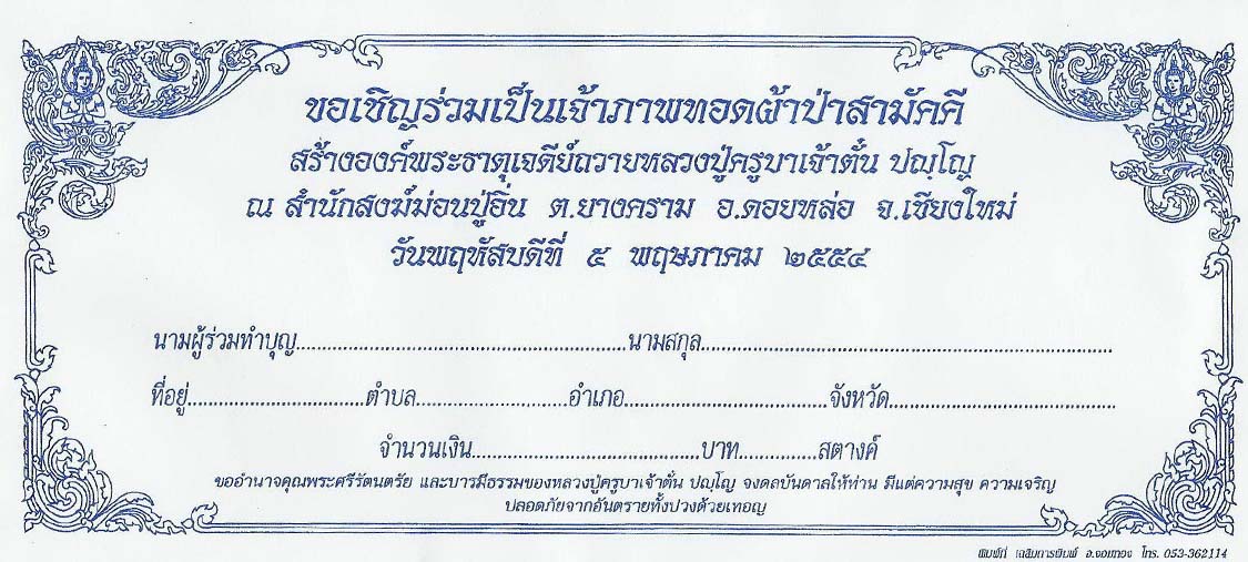 หมายเหตุ ผู้ที่จองวัตถุมงคลกับทางวัดก่อนหน้านี้ มารับวัตถุมงคลได้ในวันที่ 5 พฤษภาคม 2554 ในช่วงเช้ามีงานวางศิลาฤกษ์ และ สมโภชน์พุทธภิเษกพระธาตุ คณะกรรมการจัดสร้างจะพระทั้งหมดเข้าพิธีก่อนนำมาแจกจ่ายให้แก่ศรัทธาญาติโยมได้นำไปสักการะบูชาเป็นขั้นตอนสุดท้าย ระหว่างนั้นหลวงปู่ครูบาตั๋น จะเมตตาอธิฐานจิตเดี่ยวในฤกษ์ที่สำคัญๆ ทั้งวันพญาวัน วันเสาร์๕ ที่จะถึงนี้