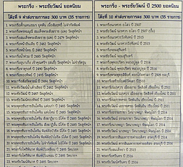 | โต๊ะ 9 พระกริ่ง-พระชัยวัฒน์ ยอดนิยม รวม 35 รายการ,โต๊ะ 10 พระกริ่ง-พระชัยวัฒน์ ปี 2500 ยอดนิยม รวม 35 รายการ |