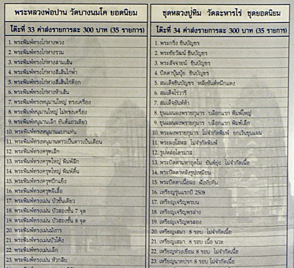 | โต๊ะ 33 พระหลวงพ่อปาน วัดบางนมโค ยอดนิยม รวม 35 รายการ,โต๊ะ 34 ชุดหลวงปู่ทิม วัดละหารไร่ ชุดยอดนิยม รวม 35 รายการ |