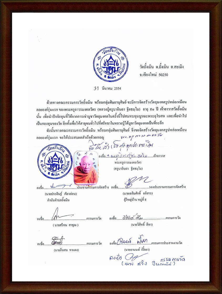 รูปหล่อลอยองค์ รุ่นแรก หลวงปู่ครูบาอินถา ฐิตธมฺโม (พระครูถาวรมงคลวัตร) เจ้าอาวาสวัดยั้งเมิน อ.สะเมิง จ.เชียงใหม่ (ภาพ พิธี อธิษฐานจิต ปลุกเสกเดี่ยว ณ อุโบสถวัดยั้งเมิน โดยมี พระสงฆ์ ๕ รูปร่วมสวด เจริญพุทธมนต์ ๑.หลวงปู่ครูบาอินถา วัดยั้งเมิน ๒.หลวงพ่อพระอธิการวัน วัดอังคาย ต.ยั้งเมิน ๓.หลวงพ่อรัตน์ วัดยั้งเมิน ๔.พระอธิการนนท์ วัดศรีดอนมูล ต.ยังเมิน ๕.พระอาจารย์หล้า วัดยั้งเมิน และ มีคณะกรรมการวัดยั้งเมิน ศิษย์ยานุศิษย์ ร่วมในพิธี เมื่อ ต้น ปี. ๒๕๕๔