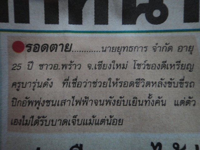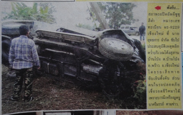 รอดตาย………นายยุทธการ จำกัด อายุ 25 ปี ชาว อ.พร้าว จ.เชียงใหม่ โชว์ของดีเหรียญครูบารุ่นดัง ที่เชื่อว่าช่วยให้รอดชีวิตหลังขับขี่รถปิ๊กอัพชนเสาไฟฟ้าจนพังยับเยินทั้งคัน แต่ตัวเองไม่ได้รับเบ็ดเจ็บแม้แต่น้อย