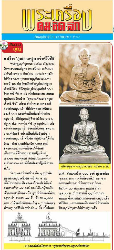 ขอเชิญร่วมบูชารูปหล่อครูบาเจ้าศรีวิไชย หน้าตัก 9นิ้ว สมทบทุนสร้างอุทยานศีลธรรม พิพิธภัณฑ์ และรูปหล่อครูบาเจ้าศรีวิไชย หน้าตัก5 เมตร