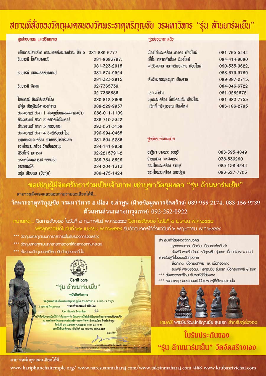 ขอเชิญร่วมเป็นเจ้าภาพสั่งจองวัตถุมงคลวัดพระธาตุหริภุญชัย วรมหาวิหาร "รุ่น ล้านนาร่มเย็น" : พระล้านนา.คอม เว็บ พระเครื่อง พระบูชา อันดับหนึ่ง ของภาคเหนือ