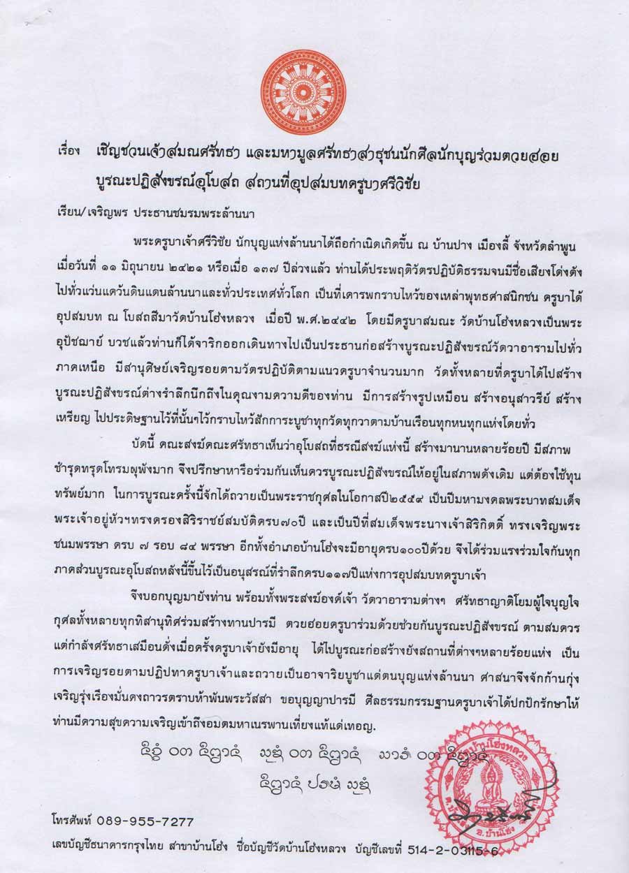 เชิญชวนศรัทธาสาธุชน ร่วมบูรณะปฏิสังขรณ์สถานที่อุปสมบท ครูบาเจ้าศรีวิชัย