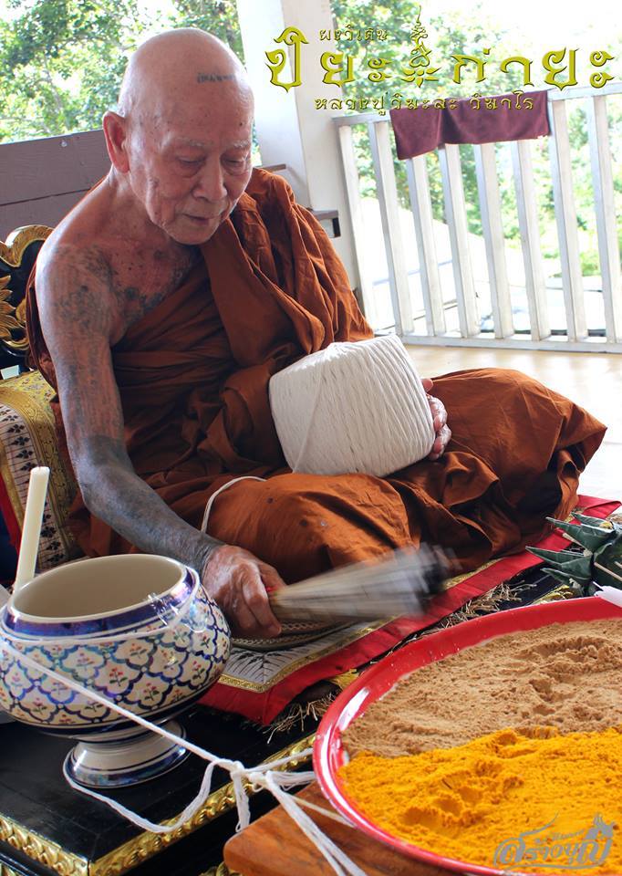 เราจึงรีบโทรหาทางวัด บอกว่าทางนี้หาของได้ครบแล้ว โยมอุปฐากใกล้ชิดของหลวงปู่บอกมาว่าวันพฤหัสที่ 28 กันยานี้ หลวงปู่ให้นำของทั้งหมด ขึ้นมาทำพิธี ซึ่งพอถึงวันดังกล่าว ผมและทีมงานก็ได้รีบขึ้นไปวัด นำของที่เตรียมไว้ไปให้หลวงปู่ทันที พอไปถึง หลวงปู่ท่านว่า จัดแจงเตรียมของ แล้วจะเริ่มพิธีเลย หลวงปู่ท่านก็ได้ใช้นิ้วจารอักขระยันต์บนผงในถาดจนครบ และใช้เวลาอยู่พักใหญ่ๆให้การบริกรรมคาถาเสกผงปิยะก่ายะนี้