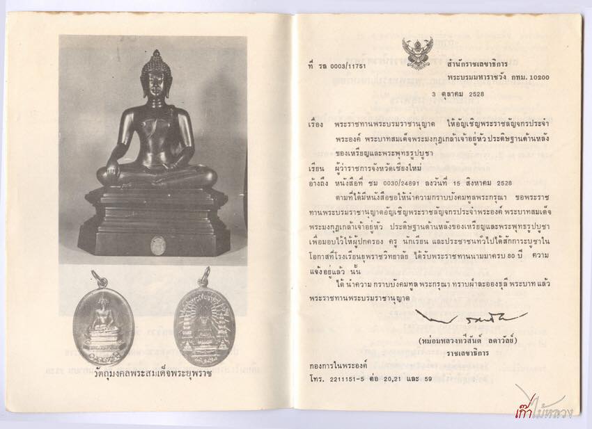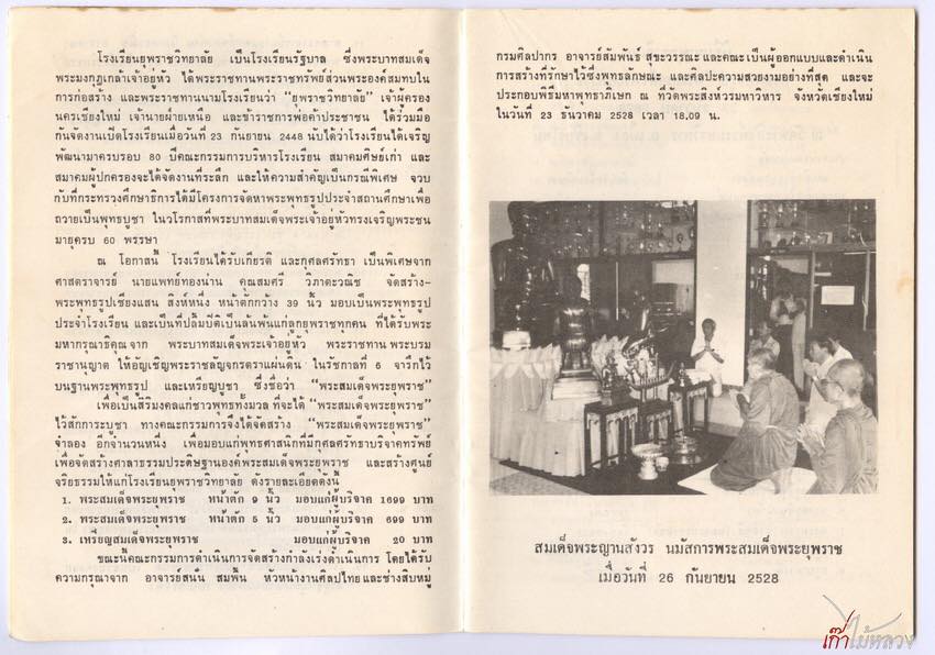 พระบูชาสมเด็จพระยุพราช หน้าตักเก้านิ้ว พระประจำโรงเรียนยุพราชวิทยาลัย ด้วยพิธีพุทธาภิเศกที่ยิ่งใหญ่โดยมี สมเด็จฯพระญาญสังวรฯ สมเด็จพระสังฆราชทรงเป็นประธานในพิธีพุทธาภิเศก ณ. วิหารหลวงวัดพระสิงห์วรมหาวิหาร จ.เชียงใหม่ พร้อมด้วยพระคณาจารย์ล้านนา นำโดยครูบาเจ้าชัยวงศ์ วัดพระบาทห้วยต้ม ครูบาอิน วัดฟ้าหลั่ง ครูบาเจ้าดวงดี วัดท่าจำปี ครูบาสิงหวิชัย วัดฟ้าฮ่าม หลวงปู่ทอง วัดพระธาตุศรีจอมทอง ครูบาคำปัน วัดหม้อคำตวง และที่สำคัญได้นำไปขอบารมี หลวงพ่อเกษม เขมโก ลงแผ่นทองชนวนร่วมอธิษฐานจิต เมื่อวันที่ 23-24 ธันวาคม 2528