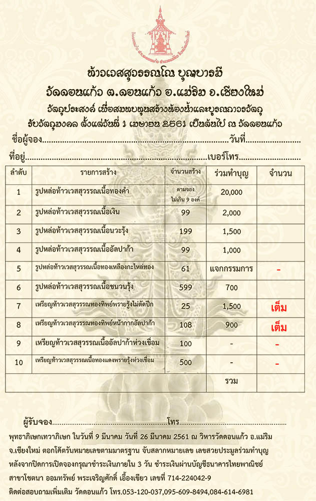 1.เนื้อทองคำ ตามจองไม่เกิน 9 องค์ บูชาองค์ละ 20,000 บาท