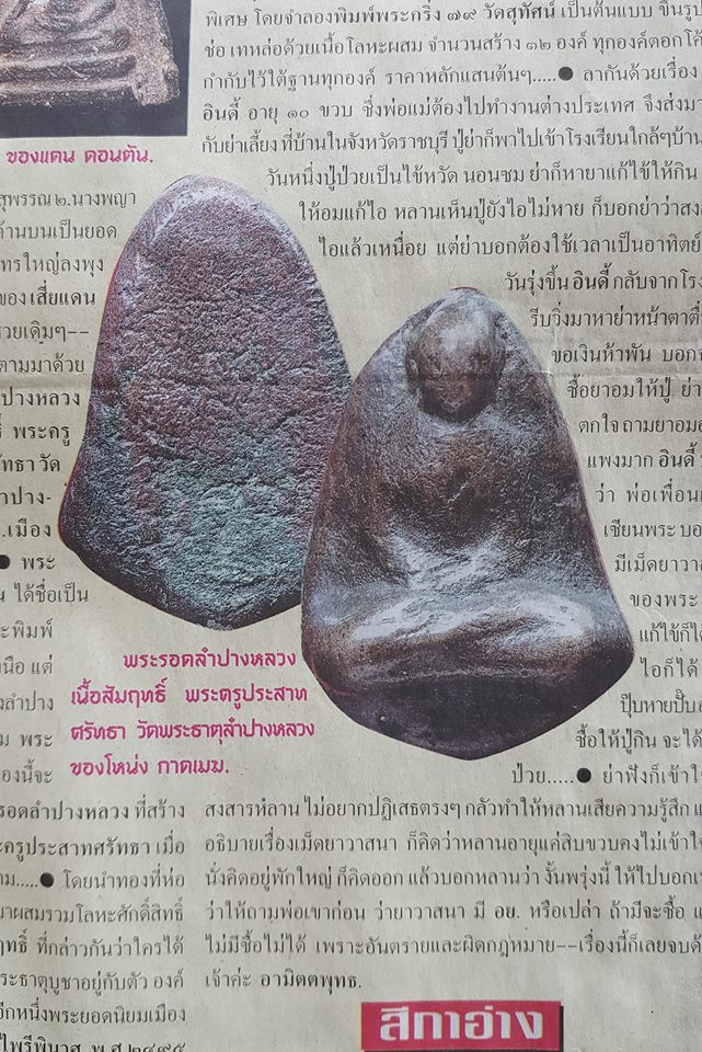 พระรอดลำปางหลวง พิมพ์พระลือ พิมพ์พิเศษองค์นี้ได้จาก คุณ หนึ่ง ลำปางหลวง หรือ drem99(ลองเข้าไปดู) ผู้มีความชำนาญในการดูพระรอดลำปางหลวง(คมสัน เกาะคา และอีกหลายๆท่าน) เขาซื้อ-ขาย ผ่านตาพระรอดมาเป็นจำนวนมาก องค์นี้พิมพ์พิเศษ เข้าใจว่าสร้างหลักหน่วย พิมพ์พิเศษก็มีหลายพิมพ์นะครับ แต่ละพิมพ์นั้นสร้างจำนวนไม่มาก นับองค์ได้ ที่เราๆท่านๆห็นบ่อยๆก็จะเป็นพิมพ์ เขียด(อีแอ้ม)เรียกตามท้องถิ่น หมายถีงเขียดตัวเล็ก วันนี้(10/ุ6/61)หนังสือพิมพ์ไทยรัฐให้เกียรติลงพระรอดลำปางหลวง ของคุณ โหน่ง กาดเมฆ ผู้ผลักดันพระสายเหนือ พระเมืองลำปาง โดยเฉพาะหลวงพ่อเกษม ขอชื่นชมครับ