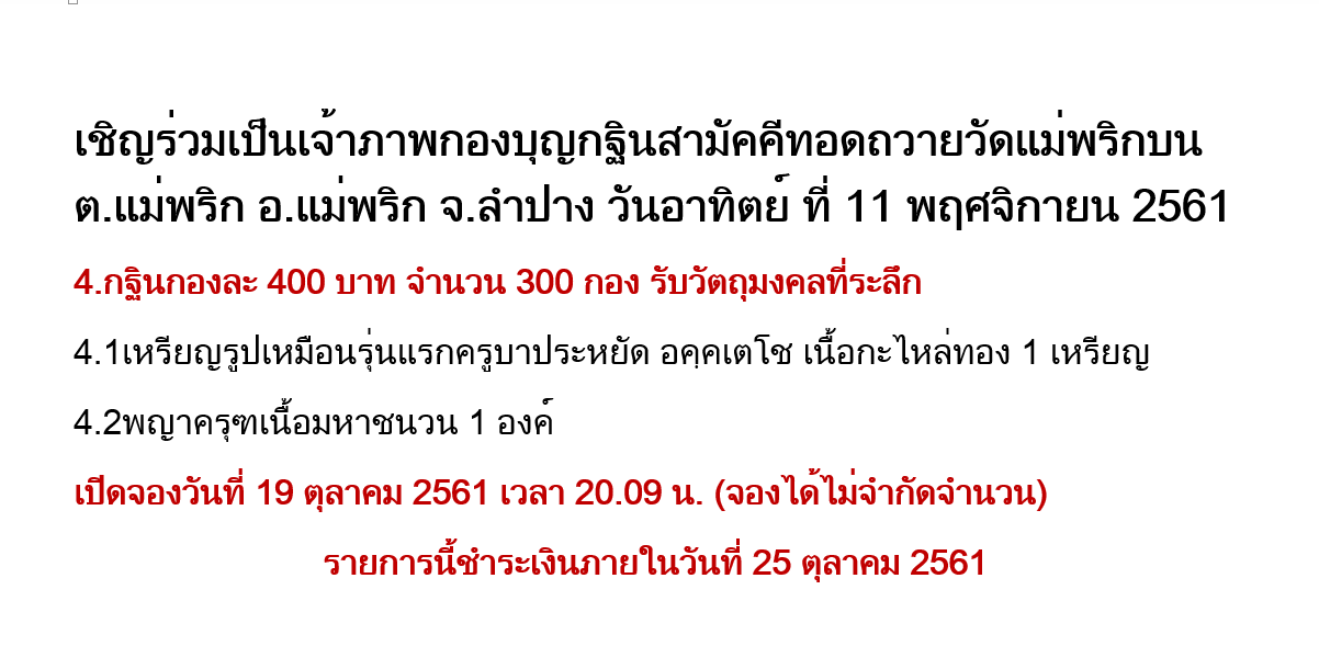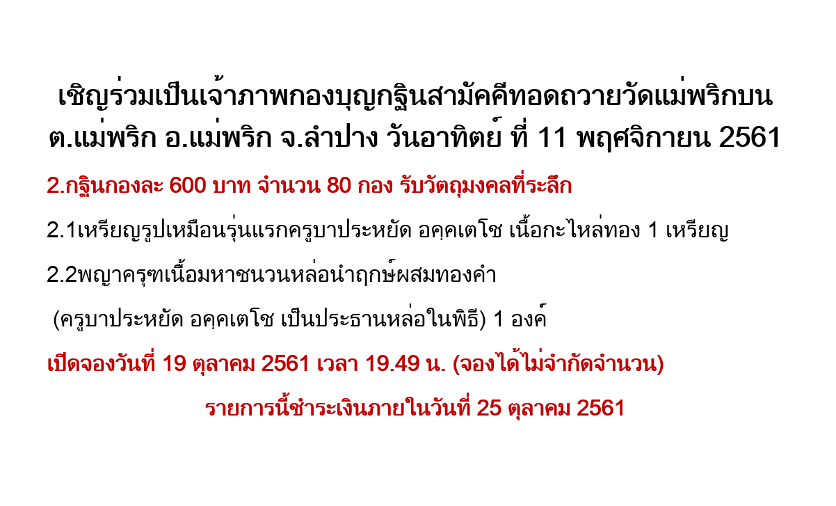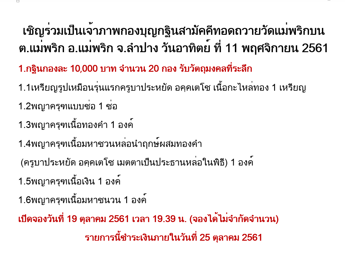 จองได้ใน Facebook กลุ่มบุญรักษา ครูบาหยัด วัดแม่พริกบน