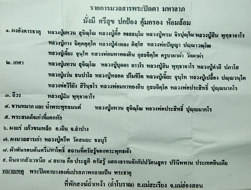 พระอาจารย์จรัญบอกว่า เกศาข้างหน้าจะเป็นเกศาหลวงปู่สิมครับ เพราะบางองค์ท่านก็ใส่เกศาน้อย บางองค์ท่านก็ใส่เกศาเยอะ ถ้าไม่ของหลวงปู่สิม ก็เป็นพ่อแม่ครูบาอาจารย์รุ่นใหญ่ ตามใบฝอยครับ ส่วนจีวรที่ติดด้านหลังนึ้เป็นจีวรที่หลวงปู่สิมท่านใช้บ่อยๆครับ พระรุ่นนึ้ท่านอาจารย์ใส่อังคารของครูบาอาจารย์เยอะมากครับ บางองค์ขึ้นพระธาตุครับ พระปิดตารุ่นนึ้มีประสบการณ์เรื่อง เมตตามหานิยม โชคลาภ ค้าขาย ดีมากๆ แคล้วคลาดปลอดภัย ลูกศิษย์ทราบกันดี และยังเหมาะกับการปฏิบัติธรรมอีกด้วย
