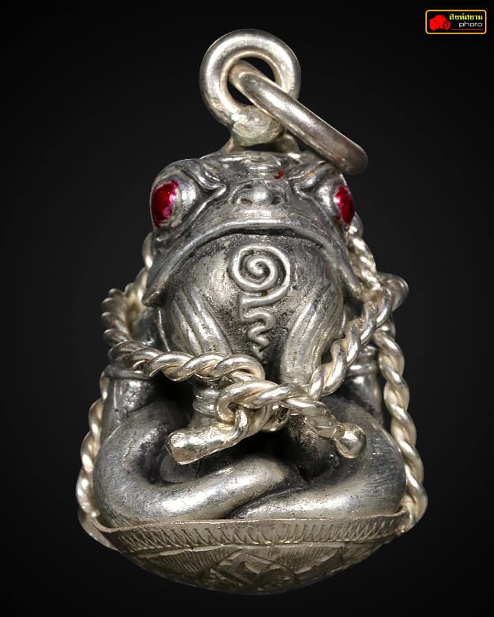 #พญากบตาแดงกินเดือน รุ่นแรกราชาโชคครูบาออ สำนักสงฆ์พระธาตุดอยจอมแวะ เนื้อเงินยวง เจ้าของเดิมเลียมกระเช้าเงินสวยเข้มขลัง ครูบาออให้สร้างพญากบตาแดงกินเดือน รุ่นแรก ด้วยเนื้อแร่เงินยวง (ไทยใหญ่เรียกว่า เงินเรียกเงิน หรือ เงินต่อเงิน )เป็นตัวกบพยนต์ มีอักขระยันต์เสริมดวงเต็มหลัง กำลังอ้าขยายปากใหญ่ กินดวงเดือนเข้าไปทั้งดวง (ดวงเดือน แทนด้วยทรัพย์สินเงินทอง ศิริมงคล และทรัพย์สินเงินทองทั้งปวงในโลกมนุษย์ กบกินเดือนภาคกลางเรียกว่า พระราหูอมจันทร์ มีอานุภาพในด้านดับทุกข์ร้อน ดับปัญหา เสริมดวงชะตา ให้เจริญรุ่งเรืองใครดวงตก ต้องพกราหู ติดต่อสอบถาม เเอดไอดี LINE jack0810312139 WeChat ID 微信 jackchianbgdao โทรศัพท์ 081-0312139
