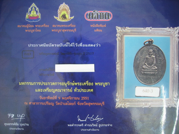 เหรียญรุ่นแรก ลพ.มี วัดมารวิชัย ปี 07 หน้าแก่นิยม เลี่ยมทอง พร้อมใบประกาศ 2 ใบ ที่ 3