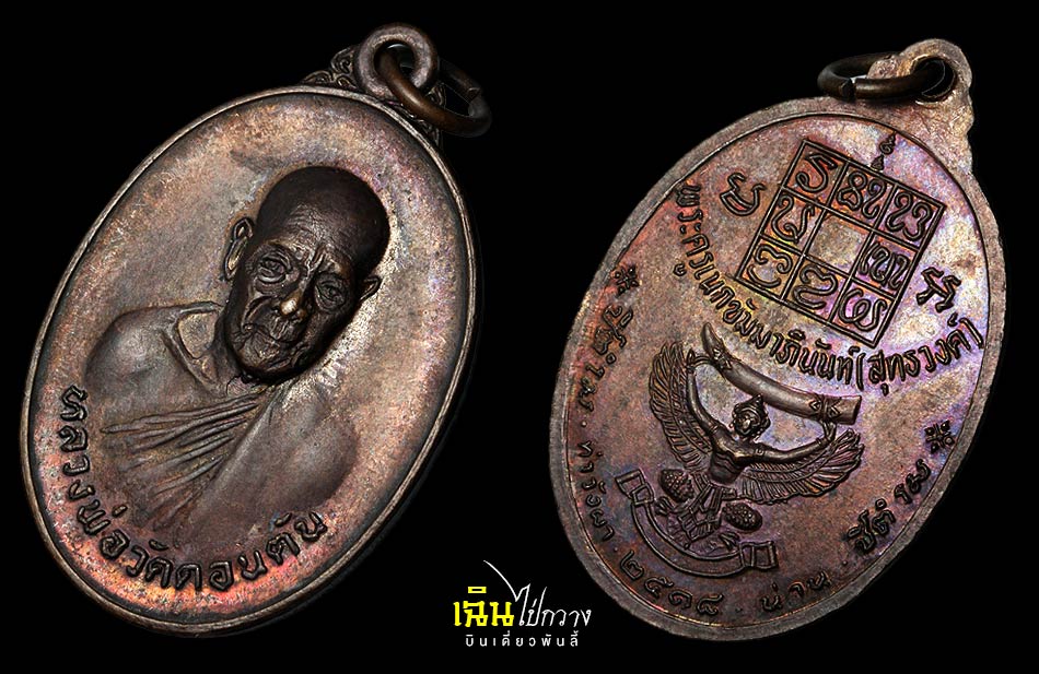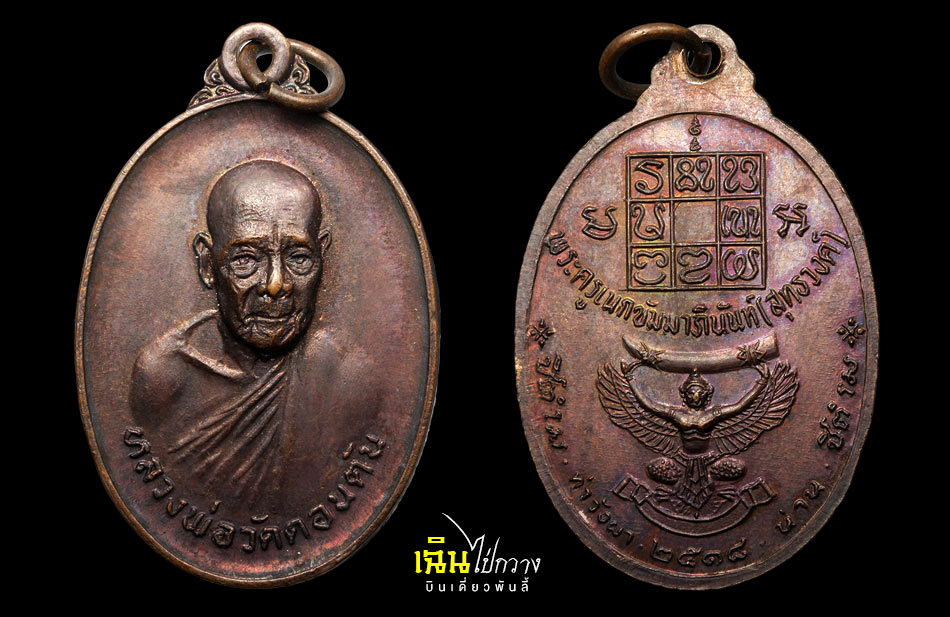 เหรียญ หลวงพ่อวัดดอนตัน หรือพระครูเนกขัมมาภินันท์ (สุทธวงศ์ พุทธวังโส) วัดดอนตัน อ.ท่าวังผา จ.น่าน รุ่น พญาครุฑแบกงาช้างดำ (งาเล็ก*) /// จัดสร้างโดย พระอมรสุธี ผู้ช่วยเจ้าอาวาสวัดพระเชตุพน (วัดโพธิ์) โดยมีวัตถุประสงค์ เพื่อรวบรวมปัจจัย ไปสร้างศาลาการเปรียญ วัดชะอำ จังหวัดเพชรบุรี, สร้างกุฏิสงฆ์ วัดพระธาตุช้างค้ำวรวิหาร จังหวัดน่าน, สมทบทุนสร้างอุโบสถวัดดอนตัน รุ่นนี้ถือได้ว่ามีพิธีพุทธาภิเษกที่ยิ่งใหญ่โดยได้เชิญพระเกจิอาจารย์ทั่วเมืองไทยที่มีชื่อเสียงในยุค นั้นอาทิเช่น หลวงปู่โต๊ะ วัดประดู่ฉิมพลี, หลวงพ่อแพ วัดพิกุลทอง, หลวงพ่ออุตตมะ วัดวังวิเวการาม, หลวงพ่อแช่ม วัดดอนยายหอม เป็นต้น มาร่วมปลุกเสกในพิธีที่วัดโพธิ์ ร่วมถึงหลวงพ่อวัดดอนตันได้ทำการปลุกเสกเดี่ยวอีกครั้งหนึ่งที่วัดดอนตัน จัดสร้างในปี พ.ศ. 2518 ///สวยเดิม ไม่ล้างผิว